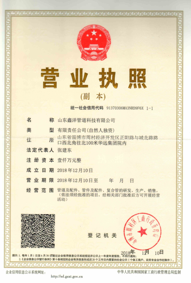 山东鑫洋管道科技有限公司是一家专业从事复合管的研发、生产、销售、技术支持及安装服务为一体的高新技术企业。注册资金1000万元人民币。主要生产钢丝网骨架塑料(聚乙烯)复合管、钢骨架聚乙烯塑料复合管、孔网钢带聚乙烯复合管、PE管以及配套电热熔管件等上千种规格产品。